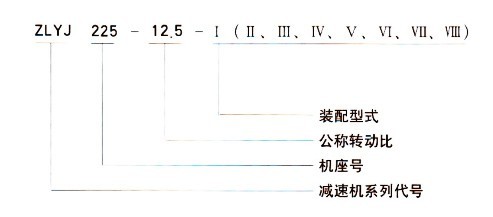 在減速機(jī)型號(hào)中,含系列代號(hào).規(guī)格號(hào)、公稱傳動(dòng)比、裝配形式。